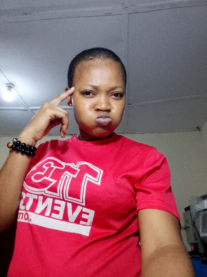 A person with short hair, wearing a red t-shirt with a white logo, is looking at the camera with a pensive expression. The person is resting their index finger on their forehead, as if deep in thought, and has pursed lips. A black beaded bracelet adorns their wrist. The background appears to be a simple room with a visible ceiling and possibly a piece of equipment to the right.