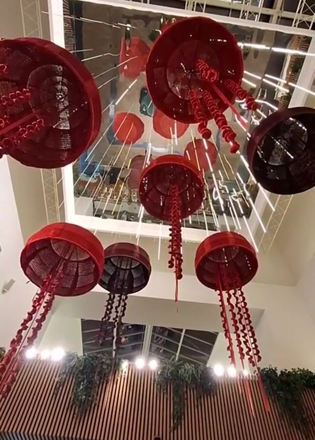 low-angle shot of a high ceiling decorated with red and dark grey jellyfish-shaped hanging ornaments. The ornaments have a round, net-like upper part and long, bead-like tentacles. The ceiling is mostly white with a grid structure and a large mirrored section. Some decorative plants are visible on a ledge below the jellyfish. There are no people immediately visible in the frame.