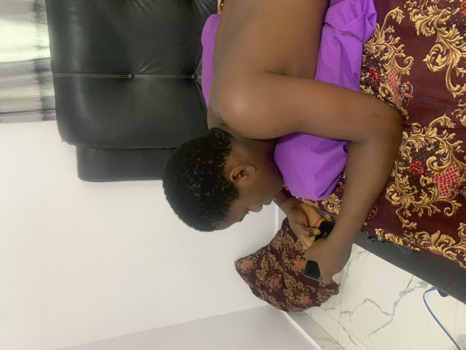 An indoor scene, situated in Aguleri, Nigeria, depicts a dark-skinned individual, identified as a young male, lying prone on a bed