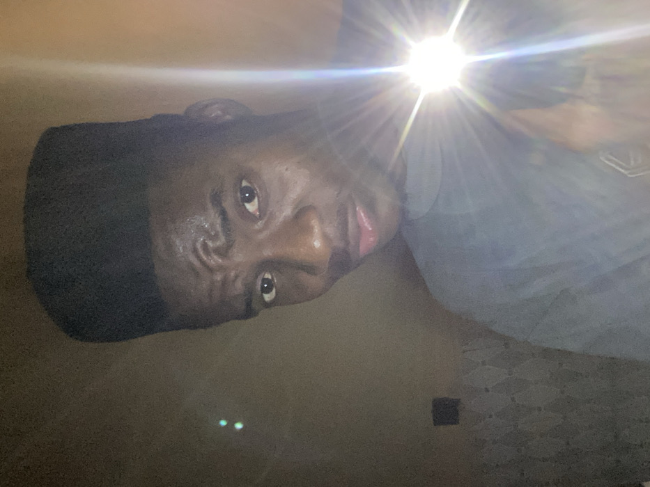 A man with dark skin and short, dark hair looks at the camera. His face is slightly wrinkled, and he has dark eyes. A bright light shines from the top right corner, creating a glare on his face and the wall behind him. The wall is a neutral color, and there is a dark square object on it. He is wearing a collared shirt. The image is tilted.