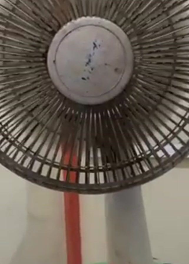 A short video shows a table fan in front of a pale yellow wall