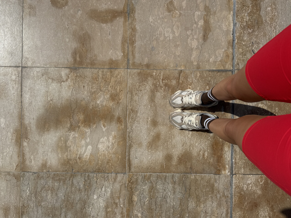 A top-down view showcases a person standing on tiled flooring. They wear red shorts, athletic shoes, and dark socks with white stripes at the top. The tiles are light brown and beige, with variations in texture and color that give them a weathered appearance. Strong sunlight casts shadows from the person's legs and shoes, highlighting the tile's surface.