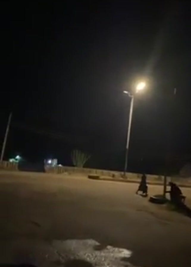The video depicts a nighttime scene under the bright illumination of a street lamp. Several individuals are visible in the vicinity, some are seated. A road or pavement spans the foreground, with a low concrete barrier in the mid-ground. The sky is dark, indicating the time of day. Beyond the immediate area, some vague background elements are visible. The recording is unstable and shaky.
