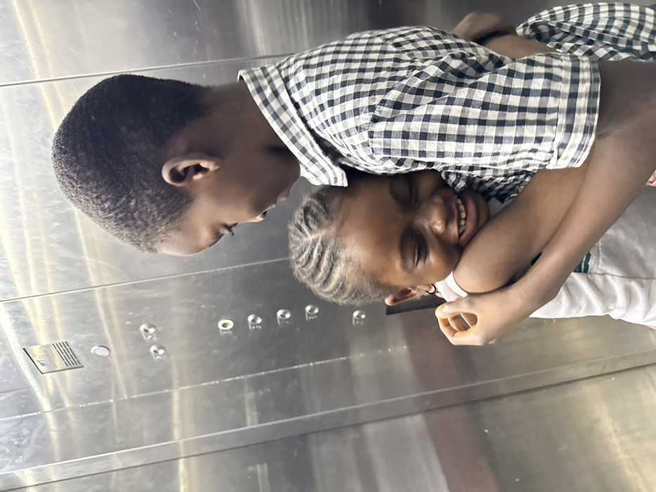Two young children, possibly siblings, are playfully wrestling inside an elevator. The older child wears a checkered shirt and has short, dark hair. The younger child, with braided hair, is laughing as they are embraced by the older child. The elevator's brushed metal wall is visible in the background, along with the buttons and display panel. The image is taken at an angle, causing a slight distortion.