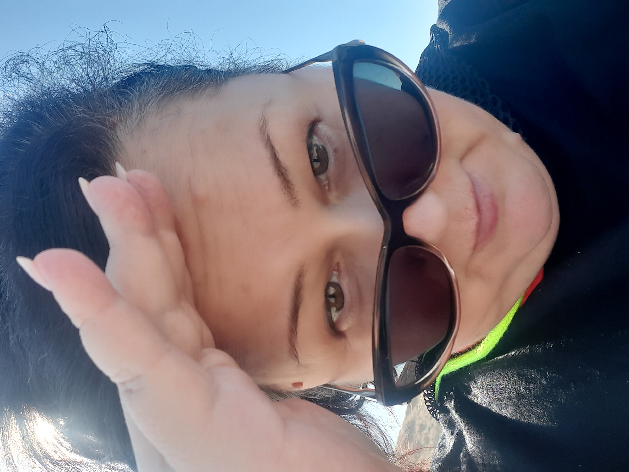 The image presents a close-up, low-angle perspective of an adult female outdoors in Hurghada, Egypt. The subject, centrally framed, faces the camera directly. She has dark hair, which appears pulled back, with some loose strands visible around her hairline. She wears brown-framed, dark-lensed cat-eye sunglasses, peering over the top of them with her brown eyes. Her right hand, exhibiting elongated light-colored fingernails, is raised to her forehead, suggesting an action to shield her eyes from sunlight. She is dressed in a dark, long-sleeved top that features a neon green trim visible around the neck area and a section of black mesh-like fabric near her right shoulder. The background consists of a clear blue sky on the right and upper portions, transitioning to a blurred, light-toned landscape, indicative of arid or coastal terrain, on the left side.