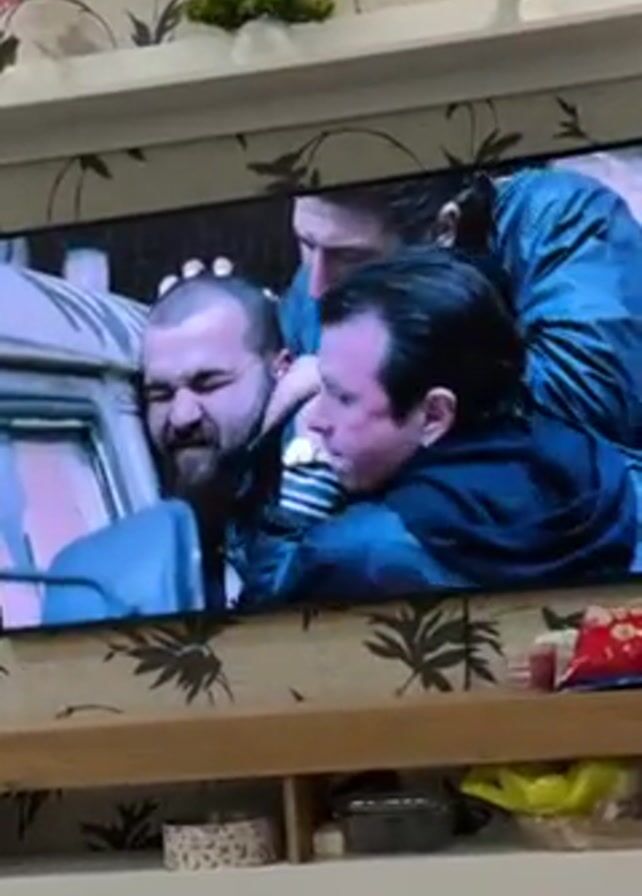 television displaying a scene with three men in close proximity, seemingly engaged in a tense or aggressive interaction. The man at the forefront has a beard and a noticeable facial expression of strain or pain. Two other men are either restraining or confronting him. The scene appears to be set in or around a vehicle. The television is mounted on a wall above a wooden shelf unit with decorative objects. The room has a patterned wallpaper with floral and leaf designs. In the lower portion of the frame, there is a glimpse of a table and other miscellaneous items.