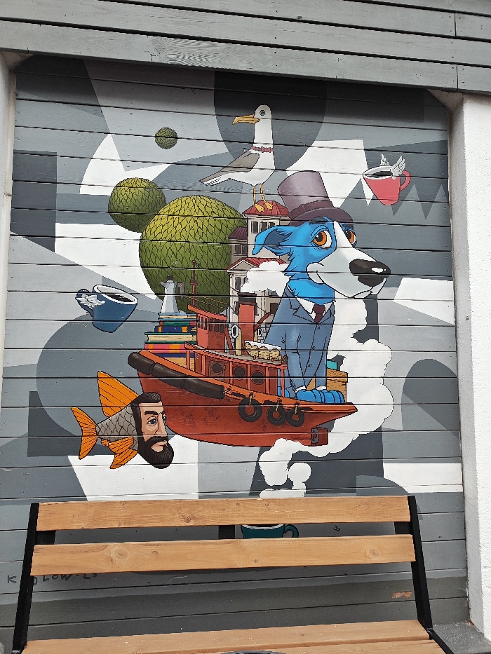 An exterior wall featuring a vibrant, surreal mural is depicted. The wall consists of horizontal wooden planks painted in shades of grey and white, forming an abstract background. A light brown wooden bench with a black metal frame is positioned in the immediate foreground, partially obscuring the bottom left of the mural. The central subject of the mural is a stylized, cartoonish blue-furred dog with a white muzzle, wearing a grey suit, white shirt, maroon tie, and a dark grey top hat. The dog is seated within a red, floating tugboat or small vessel, which emanates white cloud-like forms from its underside. To the lower left of the boat, a grey fish with orange fins possesses a human head featuring a dark beard and mustache, looking towards the right. Floating around the main figures are various elements: a blue coffee cup with white steam to the left, two large and one smaller spherical green objects resembling trees or bushes, a white lighthouse with a red top resting on a stack of colorful books, and several small buildings with red roofs. A white seagull with yellow legs and beak is perched atop one of these buildings in the upper middle. In the upper right, a red coffee cup with white wings floats. The artist's signature, "K. KOTOW. LS", is visible in black text on the lower left of the mural, behind the bench. This mural is located in Sevastopol, Ukraine, consistent with the known public art works of Kirill Kotow.