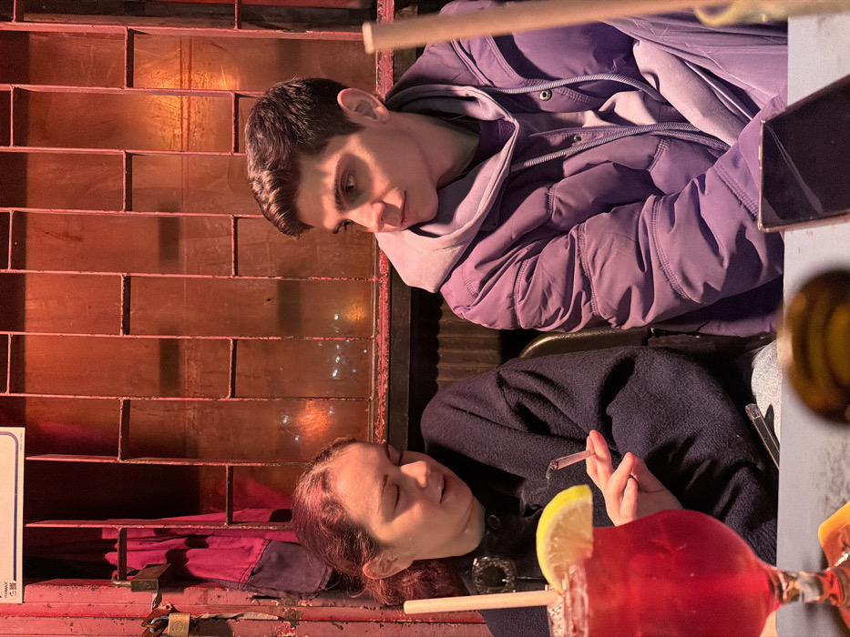 Two individuals are positioned near a brick wall. One person, wearing a purple jacket, is looking down with a somber expression. The other person, wearing a black coat, is reclining and holding a cigarette. A red cocktail with a lemon slice is visible in the foreground. The scene is dimly lit, evoking a casual and intimate atmosphere.