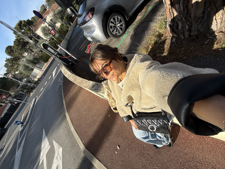A female individual is depicted in a sunlit outdoor scene on a street in Le Cannet, France. She is positioned on a low concrete curb, appearing to recline, with her head tilted back slightly, facing upwards and to the right. She wears large, tortoise-shell patterned sunglasses, a cream-colored textured jacket with dark trim, light blue jeans, and holds a black quilted handbag with a silver circular clasp and chain strap. A silver bracelet is visible on her left wrist. Her left arm, clad in a black sleeve, extends into the foreground, indicative of holding a camera. The background features a paved road with white directional arrows and dashed lines. Adjacent to the curb is a reddish-brown pedestrian path. Street signage includes a red triangular yield sign, a blue directional sign, and a red circular no parking/stopping sign. A silver compact electric vehicle is parked, connected by red cables to a charging station, indicating it is currently charging. Residential structures with tiled roofs and extensive Mediterranean vegetation, including trees and shrubs, line the street. The scene is illuminated by direct sunlight, casting distinct shadows under a clear blue sky.