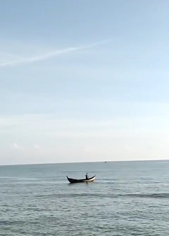 small, dark boat in the middle of a calm, blue sea under a light blue sky with a single, thin cloud. A person is visible in the boat. In the distance, another boat can barely be seen. The water is slightly rippled.