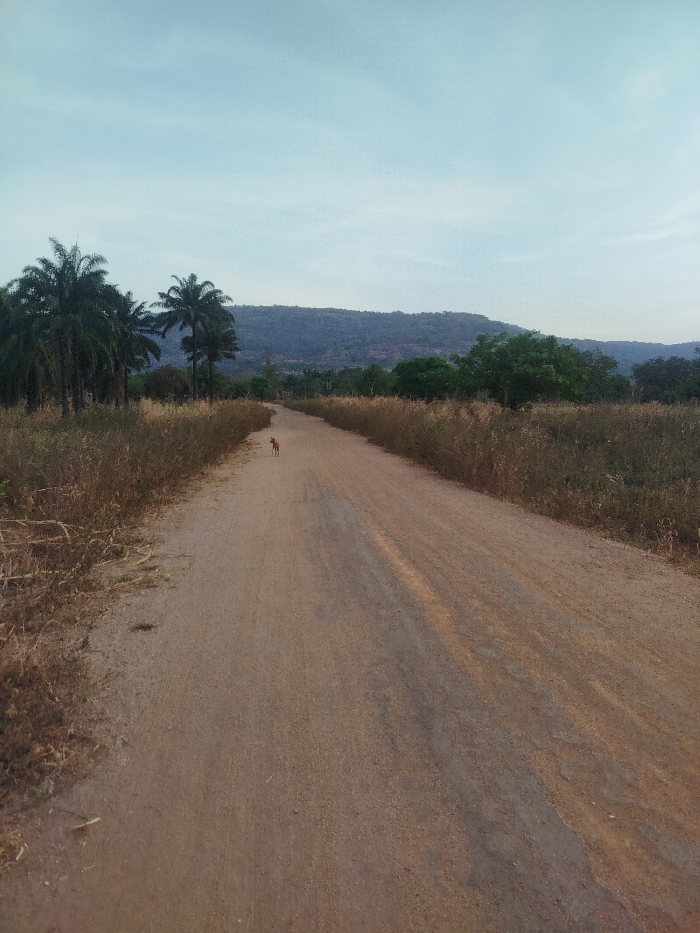 This image captures a wide, unpaved dirt road in a rural area of Vana, Nigeria