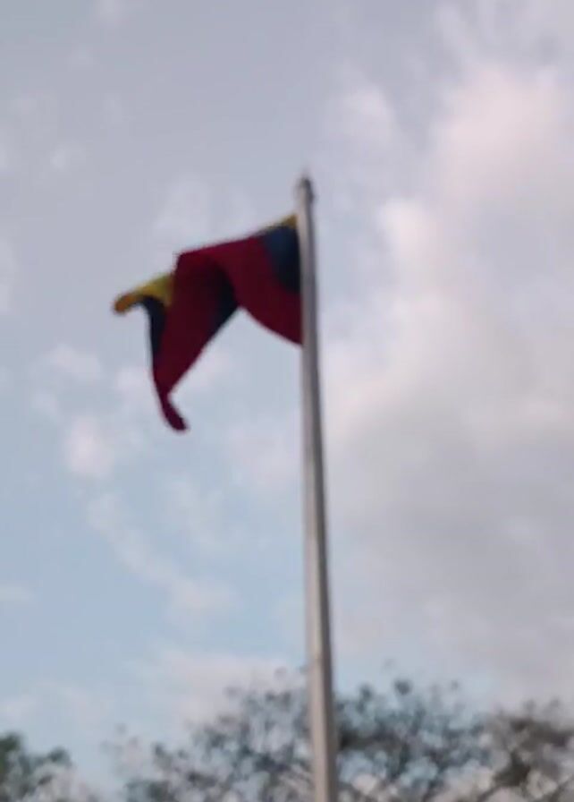 A low-angle shot displays a flag of Venezuela, waving in the wind at the top of a silver pole