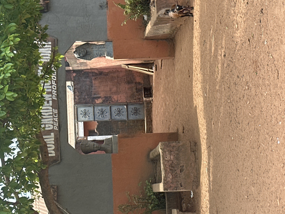 This image depicts the entrance to "Dual Garden Hot[el/use] Idah" in the city of Idah, Nigeria. An archway with terracotta-colored and gray-painted walls forms the primary entry point. A white sign mounted above the archway displays the partially obscured black text "DUAL GARDEN H[OTEL/USE] IDAH" and "PEACE PROFOUND." Green tree foliage overhangs the upper portion of the archway and sign. Two gray busts are affixed to the entrance walls: one resembling Nefertiti is on the left, and one depicting a Sphinx or ancient Egyptian pharaoh is on the right. The ground in the foreground and leading through the archway is packed dirt. On the left, a rectangular concrete planter holds sparse green vegetation. A similar concrete planter with plants is situated on the right. A small, brown and black goat stands facing away from the viewer on the right side of the dirt path, near the right planter. In the background, behind the archway, a dark reddish-brown wall is visible. To its left, a structure composed of four square panels, each featuring a symmetrical floral design, stands. Wooden planks are propped against a wall further back on the right side of the entrance. No human subjects are present in the scene.