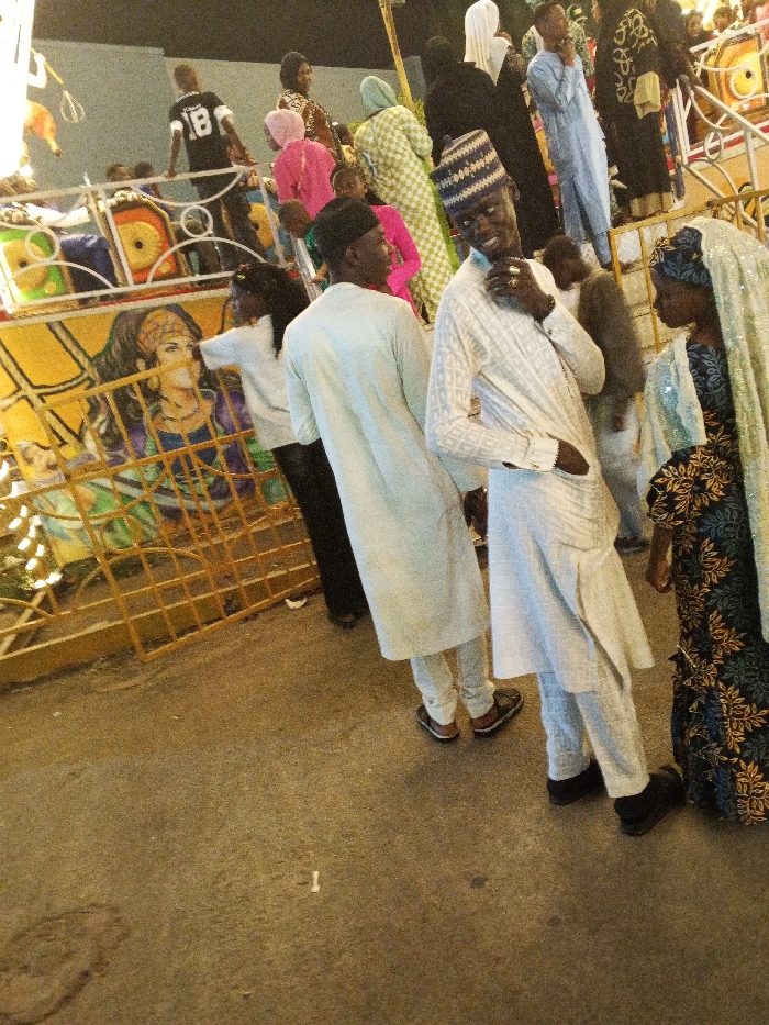 A group of people are gathered outdoors, possibly at a fair or festival, judging by the ride visible in the background. Several individuals are wearing traditional Muslim attire, including head coverings for women and long robes for men. One man in a patterned cap and robe is looking towards the camera, while others are talking or looking around. The light is dim, suggesting it is evening.