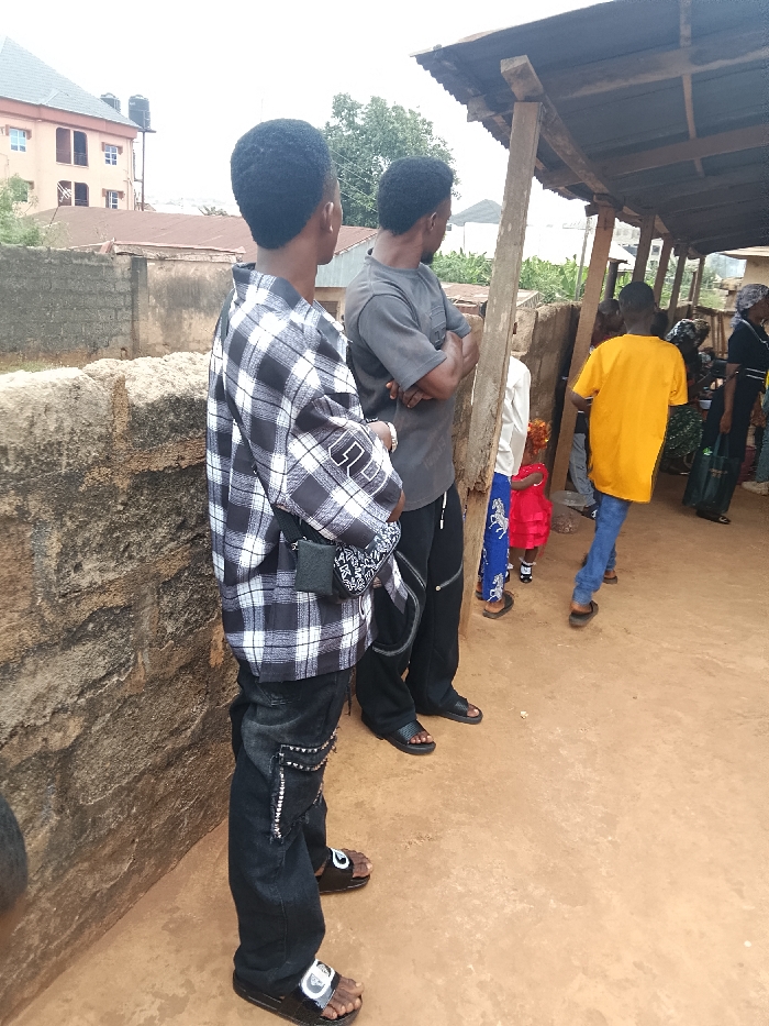 This image depicts an outdoor scene in Nsugbe, Nigeria, featuring multiple individuals on a reddish-brown dirt surface under an overcast sky. In the immediate foreground, a male with short dark hair stands with his back partially to the camera, wearing an oversized black and white plaid shirt with a white "R" on the right sleeve, dark denim jeans with silver studded accents, and black slides with white circular emblems. Two small black pouches are attached to his left hip. To his right, a second male with dark, curly hair stands with crossed arms, wearing a grey t-shirt, black pants, and black slides. Both stand next to a low, rough-hewn concrete wall. In the mid-ground, a rudimentary shelter with a corrugated metal roof supported by wooden posts extends to the right. Beneath and beyond this structure, several other individuals are present: a child in a red dress with reddish-orange hair is visible, along with a male in a yellow t-shirt and blue jeans, facing away from the camera. Further back, individuals in blue patterned pants and other obscured figures are present. The background reveals residential architecture, including a multi-story building with a brown exterior and dark roof, single-story structures with corrugated metal roofs, and concrete block perimeter walls, interspersed with green trees and vegetation.