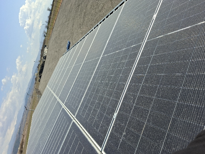 The image displays an array of photovoltaic solar panels positioned at an upward angle in the foreground, characterized by dark grey surfaces, visible grid lines, and a fine layer of surface dust
