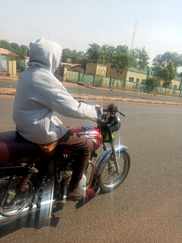 - "A person is depicted from a rear-left perspective, riding a red Bajaj motorcycle on a paved asphalt road under a bright, hazy sky in Gombe, Nigeria" by FM-l9iEo2, licensed under CC BY 4.0