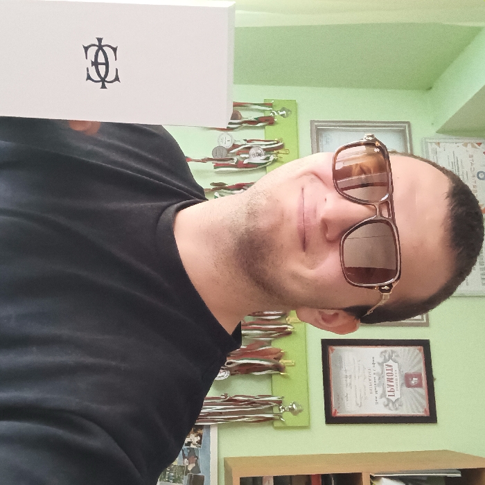 A male individual is depicted in a frontal view, smiling, wearing brown-framed sunglasses with amber-tinted lenses and a black crew-neck t-shirt. He holds a white rectangular box displaying a dark, symmetrical, stylized logo in his left hand in the lower-left foreground. The background consists of a light green wall adorned with multiple framed certificates, including one with "ГРАМОТА" (Gramota) in Cyrillic script. Below the certificates, a light green rack holds numerous medals suspended by multi-colored ribbons (red, white, brown, green). A light-colored curtain or window edge is visible on the far left, and a wooden shelf is partially visible on the far right. The scene is an interior setting located in Blagoevgrad, Bulgaria.