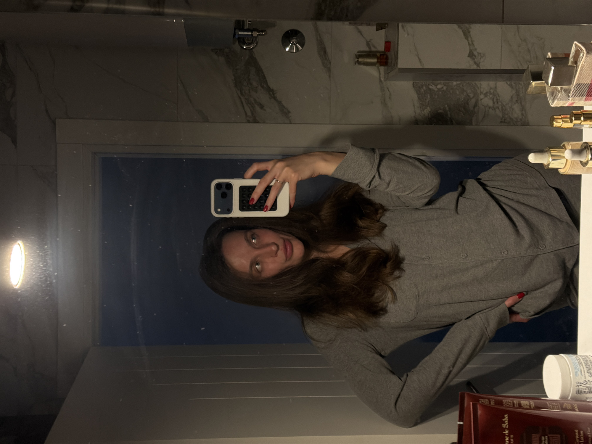 The image is a selfie of a woman with long brown hair, wearing a grey button-down shirt. She is standing in a bathroom, likely in a hotel or residence, with marble tiling behind the sink and countertop. There are various toiletry items, including lotions and bottles, on the countertop. The sink has chrome fixtures and the room is lit by a light to the left of the mirror. There is no information available about the city of Budva, Montenegro.