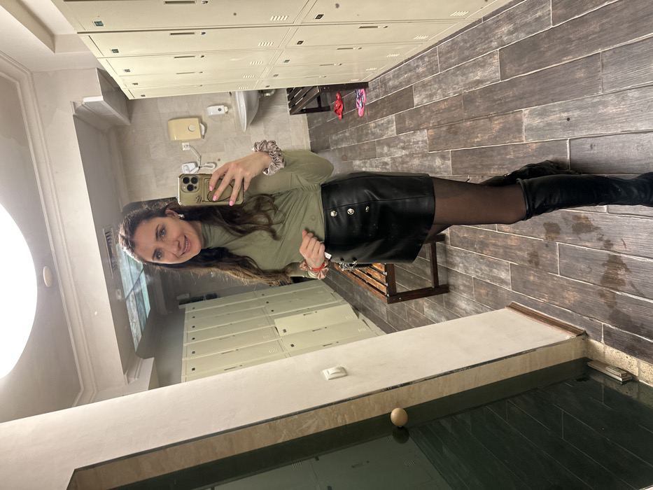 A female subject is depicted in a mirror selfie within a changing room facility in Kranevo, Bulgaria