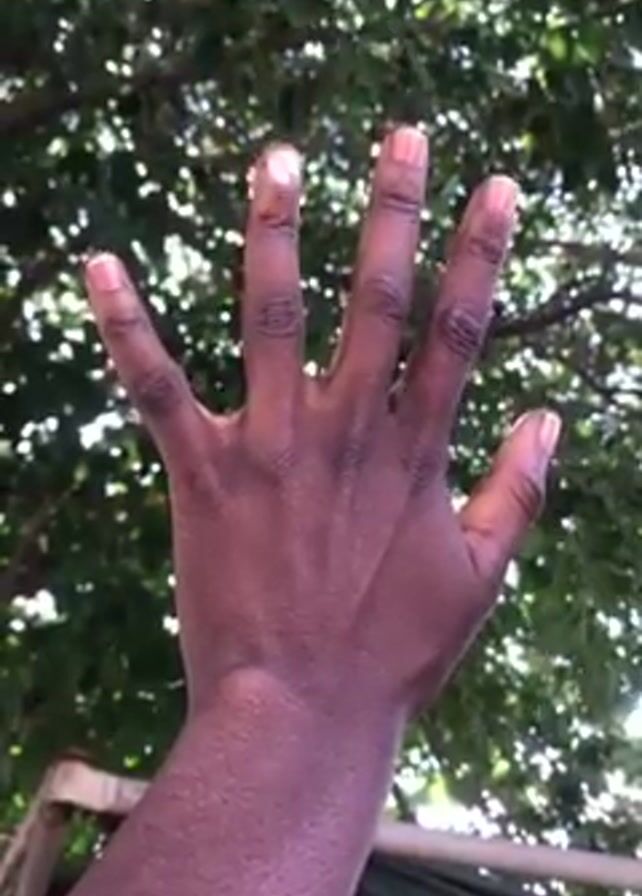 A hand with dark skin is held up against a background of green foliage. The hand is open with the fingers spread apart. The fingernails appear to be painted with a light color. A white sticker or bandage is visible on the tip of the index finger. The background consists of a tree with many leaves, and a small portion of a structure with metal supports is visible at the bottom left corner of the frame. The lighting suggests an outdoor setting during the daytime.
