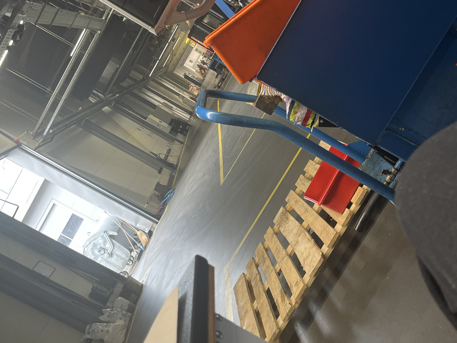 The image captures an interior view of an industrial facility in Lyaskovets, Bulgaria, taken from a low perspective. In the immediate foreground, the lower part of a dark-clothed leg or lap is visible at the bottom-left, while the right foreground is occupied by a blue industrial cart with an orange upper section and a prominent blue handle. A wooden pallet structure, consisting of multiple planks, is positioned on the floor to the left of the cart, partially obscuring a red plastic bin beneath it. The facility features a light grey floor marked with distinct yellow lines. In the midground, to the left, two white industrial sacks are stacked. Further back, through a wide, open bay door, an exterior scene is visible, featuring a large, grey wheeled industrial waste bin and a broom leaning against a wall. The background of the interior reveals exposed structural beams, overhead lighting, and ventilation ducts. In the far background, several indistinct human figures are visible through another opening, standing near pallets, suggesting an area of activity. The facility is well-lit by both natural light entering through the bay doors and artificial overhead lighting.