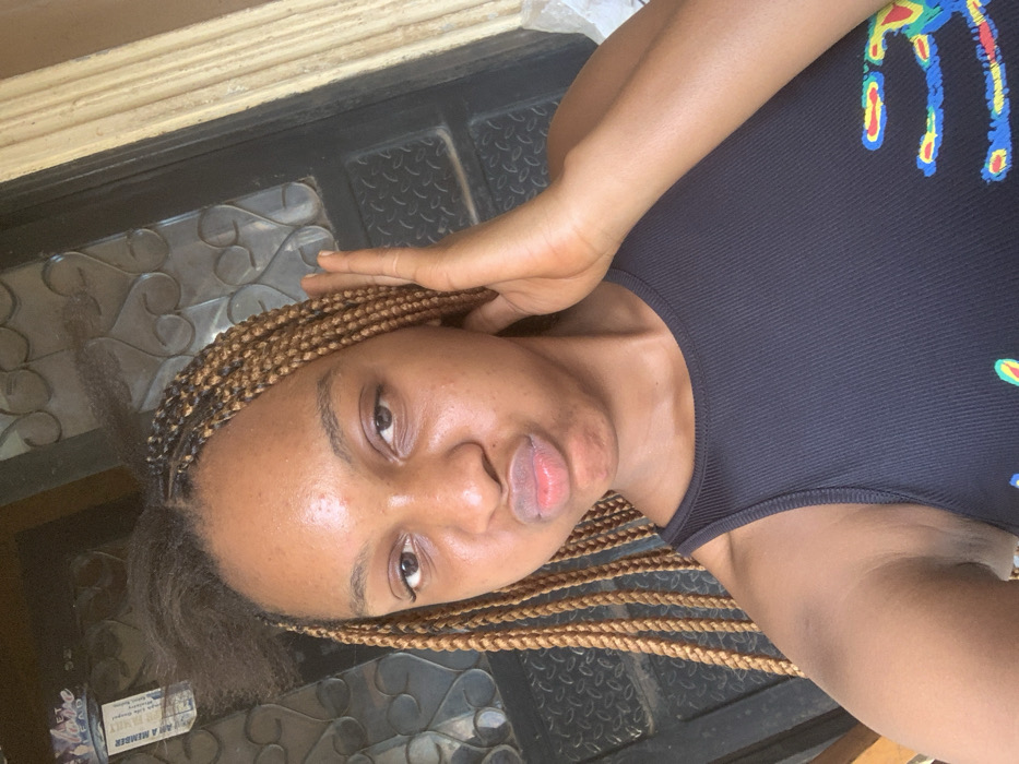 A dark-skinned woman poses for a selfie. She has long brown braids, and some of her hair is loose. She wears a black tank top with colorful thermal handprints. She puckers her lips toward the camera and rests a hand on her head. The background includes a patterned glass panel and part of a book. The image is slightly tilted.