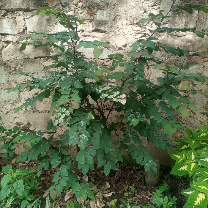 The scene depicts an outdoor environment in Kimorori/Wempa ward, Kenya. A dense, leafy shrub with numerous small, oval-shaped leaves, predominantly dark green, occupies the central and upper-mid sections of the frame. Several leaves exhibit light green, white, or reddish-pink variegation, particularly noticeable on the upper and left portions of the plant. The shrub is situated directly in front of a textured wall constructed from light-colored, rough-hewn stones or concrete blocks, with visible mortar lines. Sunlight casts distinct shadows on the upper-left section of the wall. The ground beneath the shrub is covered with a layer of dry, brown leaf litter and sparse green undergrowth. To the lower right, a portion of another plant with prominent yellow-green variegated leaves is visible. A dark, cylindrical object, potentially a discarded bottle, is partially visible near the base of the main shrub on the right side. No individuals or specific actions are depicted.