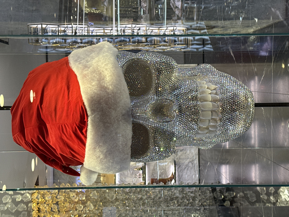 A rhinestone-encrusted skull wears a red and white Santa hat. The skull rests on a glass shelf within a display case. Above it is another shelf holding small square objects. Below the skull, gold-colored, gem-like stones sit on a lower shelf. The background is marble and glass, giving the image depth and multiple reflections.