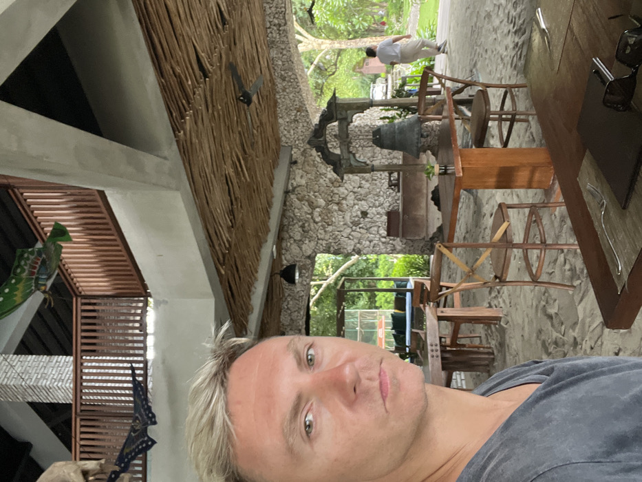 A rotated selfie features a fair-skinned person with blond hair and a gray shirt. The background shows an outdoor restaurant area. Tables and chairs are arranged on a sand surface. An elaborate stone archway with a bell is visible, leading to a garden with greenery. A figure in white is seen walking in the distance. The building behind the person has thatched roofing and decorative avian ornaments.