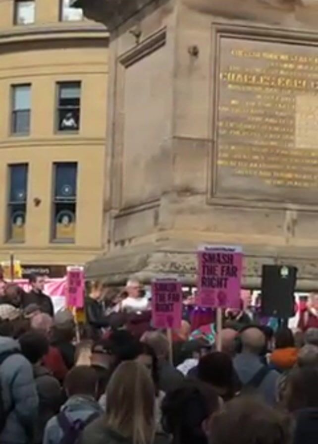 crowd of people gathered in a public square, seemingly at a protest or rally. Many people are holding signs, with several clearly displaying the message "Smash the Far Right" in bold, pink lettering and with a fist symbol. Some signs also state "Refugees and Migrants Welcome." The crowd is dense, with people standing close together. The protesters are of various ages and ethnicities. Behind the crowd is a large stone monument or pillar. A person is visible in a window of a building next to the monument. The atmosphere appears to be active and politically charged.