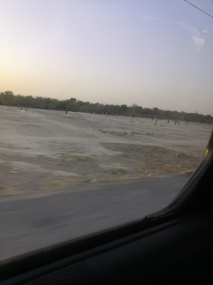 The image captures an outdoor scene in Akhundzadakhail, Pakistan, viewed from inside a moving vehicle. A dark, blurred paved road occupies the immediate foreground, with a vehicle window frame visible on the lower right, obscuring a portion of the scene. Beyond the road, an expansive, light-colored dirt and sand field extends into the middle ground. Scattered across this field are approximately 20-30 individuals, predominantly appearing as adult males, visible as indistinct figures in traditional light-colored clothing. They are dispersed across the area, appearing to be walking or standing. A dense line of green and brown trees and shrubs forms the distant background, bordering the field. The sky above is a pale, hazy blue, transitioning to a lighter, yellowish hue near the horizon, suggesting late afternoon or early morning light conditions.