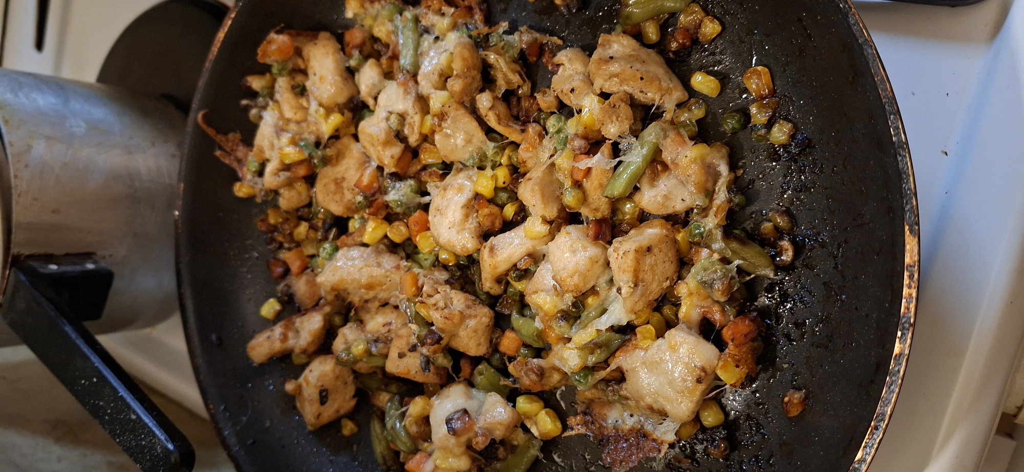 A skillet sits on a stovetop. The skillet contains cooked chicken pieces, corn, green beans, and other diced vegetables. A metal pot is also visible on the stovetop. The scene is indoors. Location is unknown and not specified in the provided context.