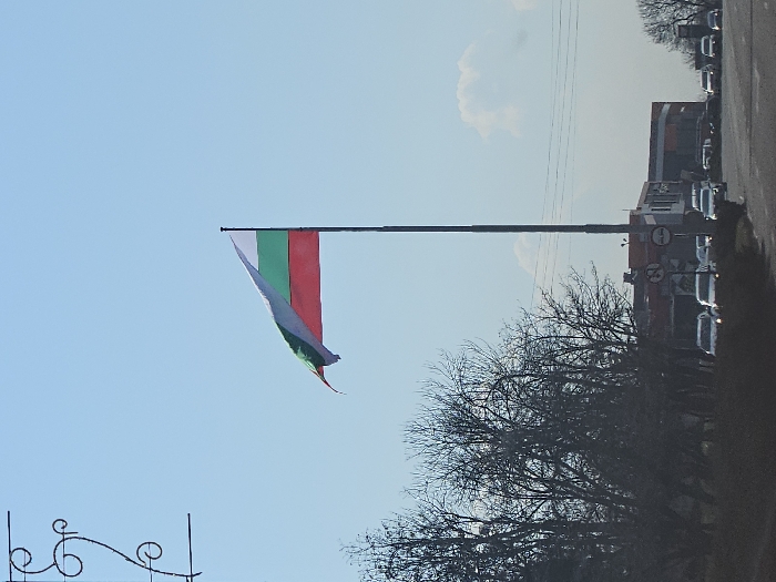 The image displays a daytime outdoor scene in Dimitrovgrad, Bulgaria, under a clear blue sky
