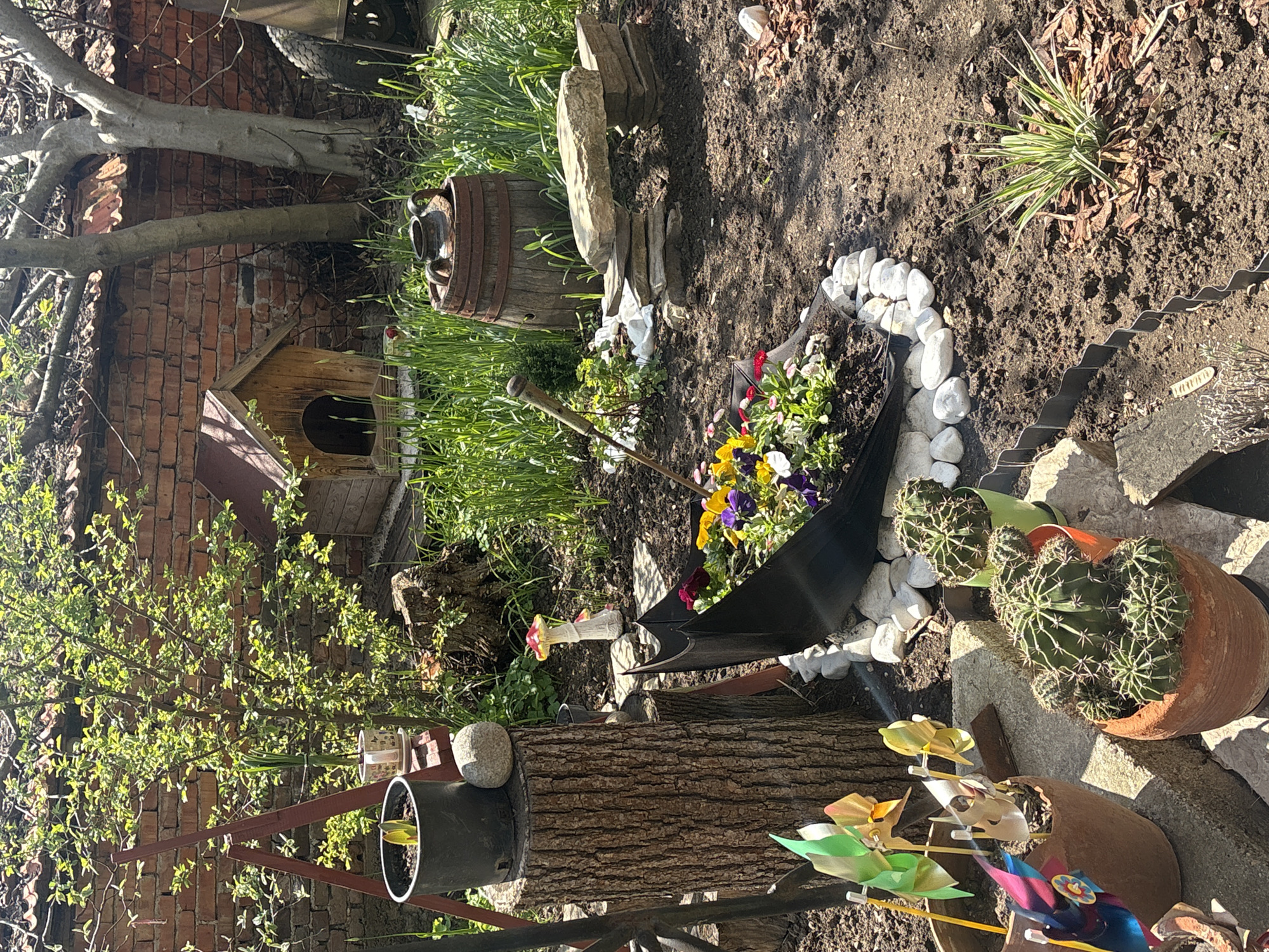 The scene depicts a garden in Unknown, Unknown, showcasing a variety of elements within a sunlit outdoor setting. A small, wooden doghouse sits near a brick wall, close to a sapling with green foliage. An upturned barrel supports a decorative setup, including a stack of stones. A flower bed with white stone edging contains mixed flowers, next to a black planter. A log lies horizontally across the foreground, supporting a pot and a sphere. A collection of colorful pinwheels are positioned nearby, adding a whimsical touch. Cacti in terracotta pots are located adjacent to the log. The ground is covered with soil and scattered plant life.