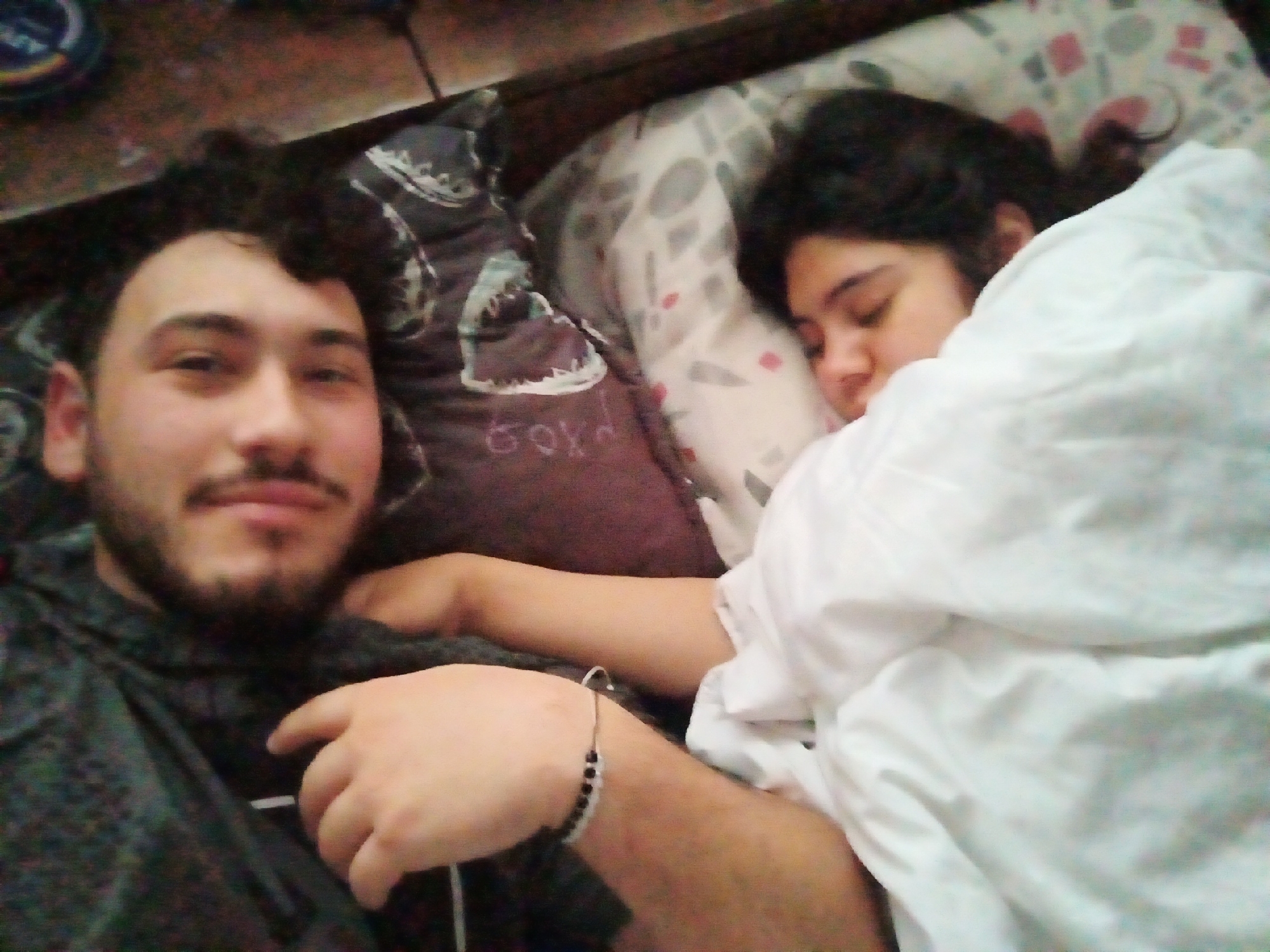 The image depicts a man and a woman lying in bed. The man is awake, looking at the camera with a slight smile. He has dark hair, a beard, and is wearing a dark patterned shirt. His left hand is visible, adorned with a beaded bracelet. The woman is asleep, covered in a white sheet with only her head and part of her shoulder visible. Her hair is dark. They are lying on patterned pillows and sheets. Based on prior knowledge of available images, the location is most likely in the city of Roman, Bulgaria.