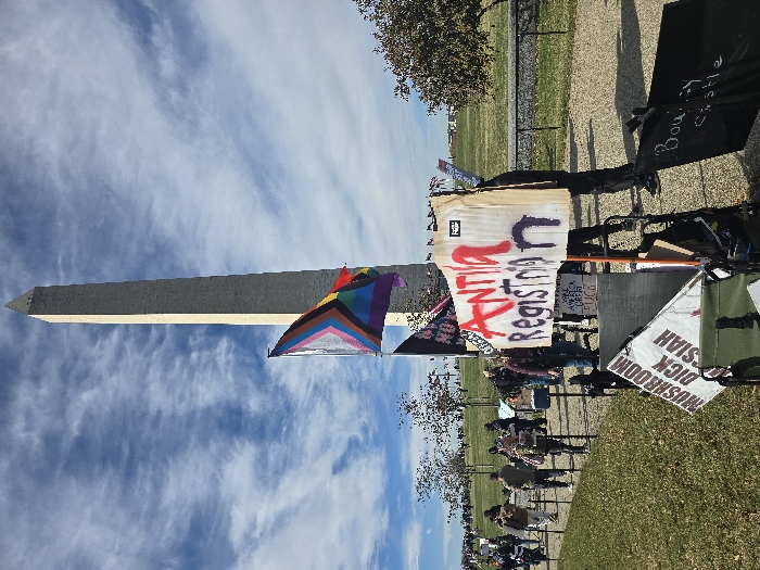 A wide shot depicts an outdoor gathering on the National Mall in Washington, D
