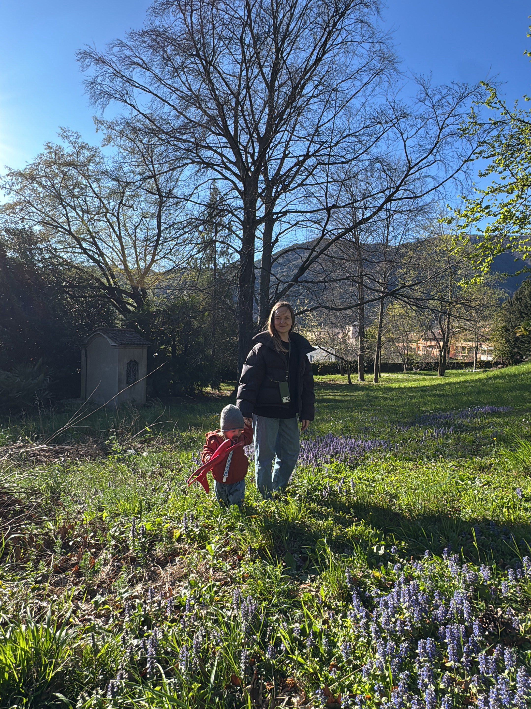 An outdoor scene in Erba, Italy, depicts two individuals in a grassy area under a clear blue sky. A female adult, dressed in a dark puffy jacket, light blue jeans, and a dark top with a lanyard around her neck, stands upright in the center-right of the frame, looking towards the camera. To her left and slightly in front is a small child, appearing to be a toddler, wearing a red jacket, light-colored pants, a grey knit hat, and a red scarf. The child faces away from the camera, looking towards the left foreground. The adult holds the child's left hand with her right hand. The ground is covered with green grass, interspersed with numerous patches of small purple flowers. Sunlight casts distinct shadows to the right of the individuals. In the left mid-ground, a small, light-colored, possibly stone structure with a sloped roof is visible. Several deciduous trees with bare branches or emerging green leaves are scattered throughout the mid-ground and background. A large, prominent bare tree stands in the central background. In the far background, light-colored buildings are discernible, backed by mountains or hills.