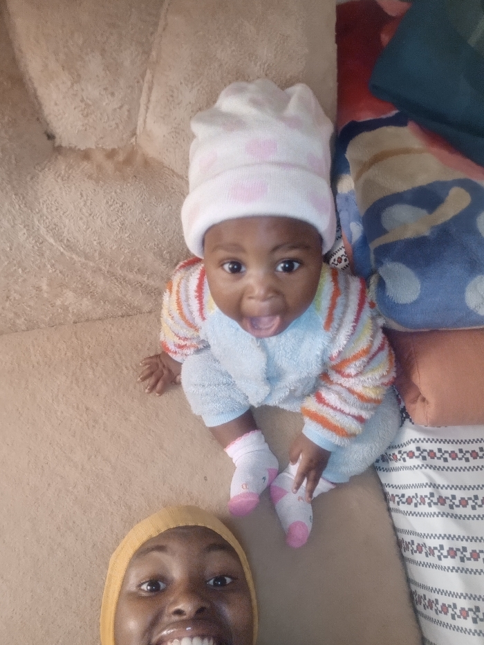 The scene depicts an indoor residential setting, likely a living room or bedroom, in Unknown, Unknown. An infant and an adult are present. A dark-skinned infant, estimated to be between six and twelve months old, occupies the upper center of the frame. The infant is wearing a white knit cap with light pink polka dots, a light blue fuzzy long-sleeved onesie with multi-colored striped sleeves (orange, yellow, blue, white, green), and white socks with pink heels/toes. The infant is positioned on a light beige, textured surface, appearing to be sitting or in a crawling posture, with both hands resting on the surface. The infant's eyes are wide open, directed towards the camera, and the mouth is open in an "O" shape, revealing the tongue. In the lower-left corner of the frame, the upper portion of a dark-skinned adult's face is visible. The adult is wearing a mustard yellow head covering and is smiling broadly with teeth showing. The adult's wide-open eyes are directed towards the camera, suggesting they are holding the device and capturing a selfie-style photograph that includes the infant. To the right of the infant, a stack of textiles is visible. From top to bottom, these include a dark teal blanket, a blue blanket with white polka dots and an abstract design, a rolled light brown blanket, and a white textile with a black and red patterned border. The background on the left consists of a fluffy, light beige upholstered surface, likely a sofa armrest or back cushion.