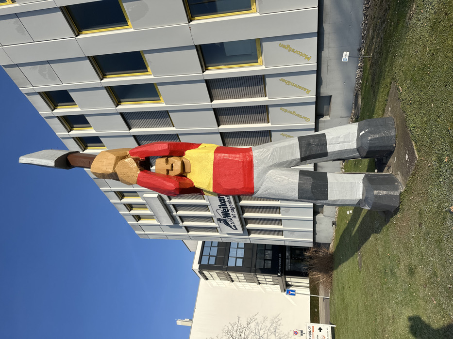 The scene is located at Rohrstrasse 44 in Glattbrugg, Switzerland. A large, block-like wooden sculpture of a person stands centrally on a patch of green grass. The figure is painted with a yellow chest, red long sleeves, gray pants with black segments near the ankles, and blocky tan hands. It holds a brown-handled axe with a silver-colored blade raised high above its head. The figure's face is simplified with horizontal black lines. Behind the sculpture stands a modern, three-story building with a light gray paneled facade, featuring numerous rectangular windows with bright yellow frames and dark horizontal blinds. Gold lettering on the building's lower facade reads "Gartengeräte", "Rasenmäher", and "Motorsägen" (Garden tools, Lawnmowers, and Chainsaws). A prominent sign on the building above the second floor reads "Weikant ist sägenhaft". To the left of the main building, a darker multi-story building with large windows is partially visible. A street sign below it indicates "Rohrstrasse 44". Further to the left, a white building is also present. In the lower left foreground, a white informational sign displays "brugge.ch" with a left-pointing arrow and "Meier AG". The ground consists of green grass with long shadows cast from left to right, indicating direct sunlight under a clear blue sky. A small "P" sign for parking is near the base of the main building. No human individuals are actively present in the scene.