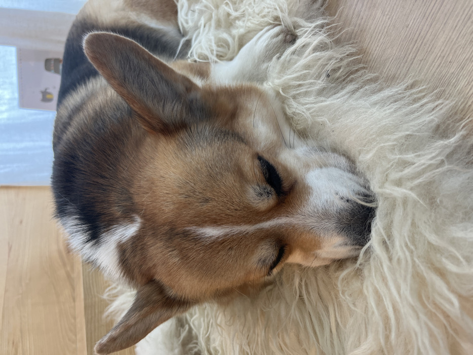 A Pembroke Welsh Corgi dog is depicted sleeping indoors in Gangloff, Germany
