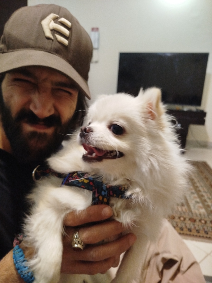 The scene is situated in Parand, Iran, and depicts an indoor setting. A male individual, partially visible on the left, wears a brown baseball cap with a beige stylized 'E' logo, a dark t-shirt, a blue braided bracelet on his right wrist, and a silver-colored ring with a red stone on his right ring finger. He has a full dark beard and dark hair, with his eyes squinted shut and face contorted in an expressive grimace. He holds a small, white, fluffy dog, resembling a Pomeranian, which wears a multicolored harness featuring a blue background with yellow, red, and black patterns. The dog's mouth is open, revealing its pink tongue and teeth, and its dark eyes are directed towards the right. In the background, a light-colored wall is visible, with a large, dark-screened television positioned above a dark cabinet on the right. A portion of a light-colored floor with a patterned rug is visible in the lower right.