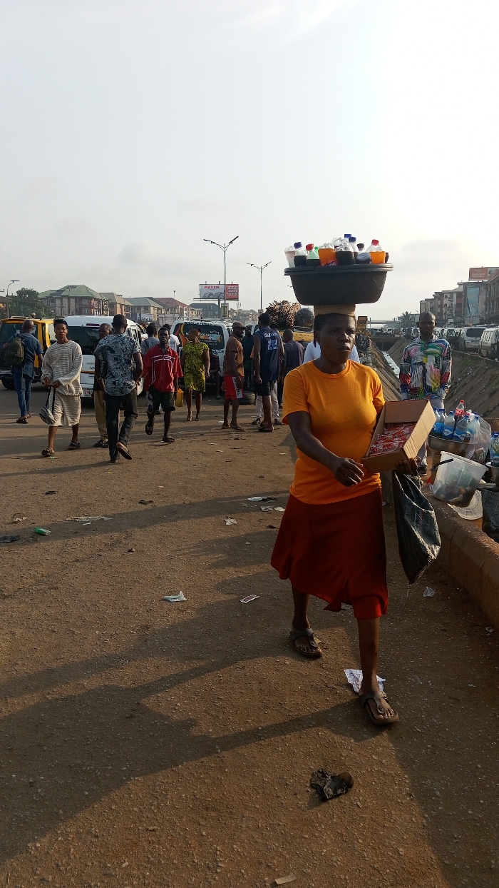 A woman with a tray of drinks on her head and a box in her hands walks along a street with other pedestrians. She wears an orange shirt and a red skirt. The area appears to be a bustling street or market with litter strewn on the ground and cars parked on the side. Some people walk in the same direction as the woman, while others walk in the opposite direction. The sky is bright and hazy.