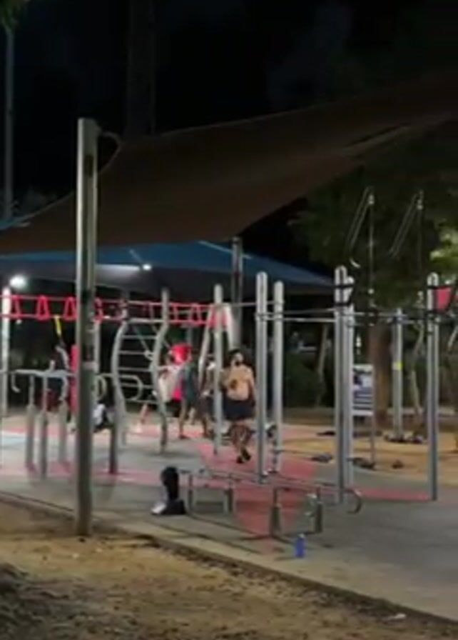 The video depicts an outdoor fitness park at night, with several people exercising. One person is performing dips on parallel bars, while others are engaged in various activities on the equipment. The area is illuminated by overhead lights, and the ground is covered with a mix of pavement and mulch. There are trees visible in the background.