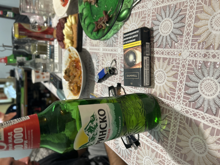 An indoor scene in a private residence or establishment within the city of Trakiya, Bulgaria, depicts a dining table covered with a light-colored lace tablecloth featuring a repeating floral pattern. In the immediate foreground, a partially consumed green glass bottle of "Pirin Svetlo" beer is positioned centrally. To its right, a black packet of "Dunhill" cigarettes displays a graphic health warning on its front, depicting an unhealthy eye. A blue and black multi-tool or lighter and a pair of black-framed eyeglasses lie between the beer bottle and the cigarette pack. In the midground, several food items are present: a white bowl containing a stew-like dish, a wooden cutting board laden with sliced cheese and cured meat, and a green plate with remnants of food, possibly beans or dried fruit, accompanied by a green spoon. The background, largely out of focus, reveals additional items on the table including various bottles, a can of "Astika" beer, a paper cup, a salt shaker, and a remote control. A person's left facial profile, showing stubble, is visible on the far left, partially obscured by the beer bottle. Another person is indistinctly visible in the blurred background beyond the table.