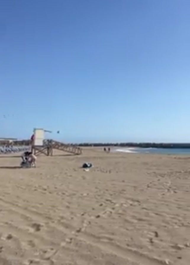 Here's a concise description of the video: **Scene:** A wide, sandy beach under a clear blue sky with scattered clouds