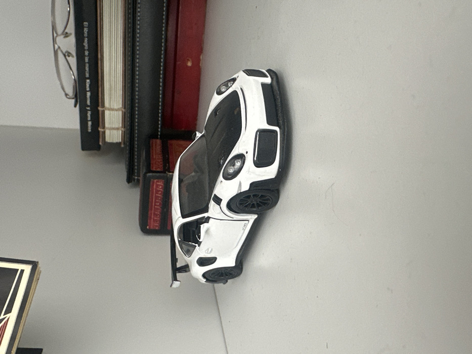 A white Porsche GT3 model car sits on a gray surface, next to a stack of books and eyeglasses
