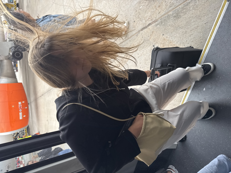 The image captures an outdoor scene at Palma de Mallorca Airport (PMI) in Son Santjoan, Spain. A fair-skinned individual with long, light brown hair, heavily affected by wind and partially obscuring their face, is shown in the process of disembarking from a vehicle, likely an airport bus or ground-level jet bridge. This individual wears a black long-sleeved top or jacket, light off-white wide-leg trousers, and black sneakers with white soles. They are actively pulling a black wheeled suitcase down dark gray steps, each marked with a yellow safety stripe. A light beige fabric shoulder bag with a drawstring closure is worn across their body, with their left hand inserted into it. In the background, a prominent orange jet engine nacelle, characteristic of an EasyJet aircraft, is visible on the concrete tarmac, along with a portion of the white fuselage and landing gear. To the right, partially visible, another fair-skinned individual with dark hair, wearing a denim jacket and light-colored trousers, stands on the tarmac, facing away from the camera, their hair also appearing wind-blown. A blurred reflection of a third person is faintly discernible in the vehicle's doorframe on the far left.