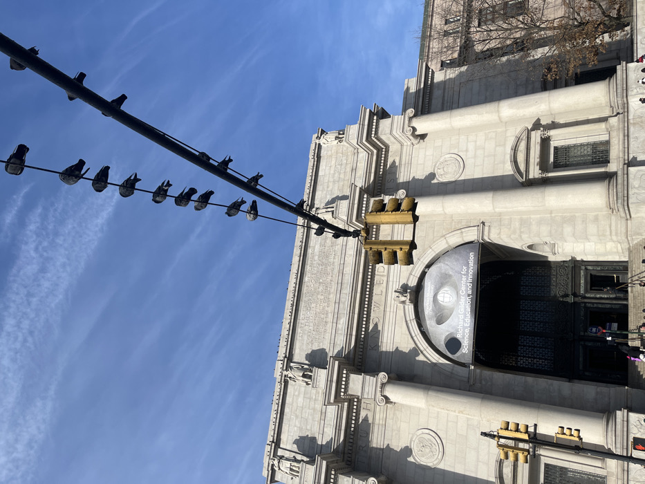 The image captures the architectural facade of the American Museum of Natural History, specifically the entrance to the Richard Gilder Center for Science, Education, and Innovation, located in New York City, United States. The grand stone building features large columns, an arched entrance with a dark, ornate gate, and a banner for the Gilder Center. Inscribed text "TRUTH KNOWLEDGE" is visible above the entrance, with further dedicatory text to Theodore Roosevelt on a frieze above. Approximately 14 pigeons are perched in a linear arrangement on a dark, angled cable or overhead wire in the upper right portion of the frame, with more pigeons scattered on the building's ledges. Two sets of yellow-cased traffic lights hang from street poles; one set is centrally positioned, while another is partially visible on the left. The scene is set under a clear blue sky with light, wispy clouds. Several indistinct human figures are visible on the steps leading to the museum entrance. Bare tree branches on the right side of the frame suggest a late fall or winter season.