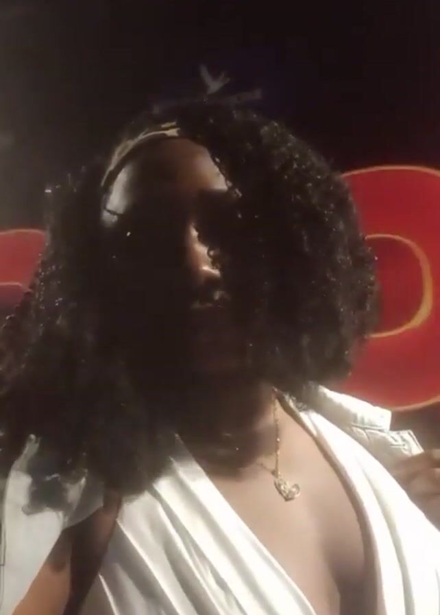 A woman is taking a selfie video, likely in a club. She is wearing a white dress with a low neckline, a leopard-print headband, and a gold necklace with a pendant. Her hair is curly and black. The lighting is dim, but bright lights occasionally shine on her face. In the background, there is a large red and white sign with text, including the word "RED." The woman looks at the camera and smiles. She briefly places her hand on her shoulder. There is music and voices in the background.